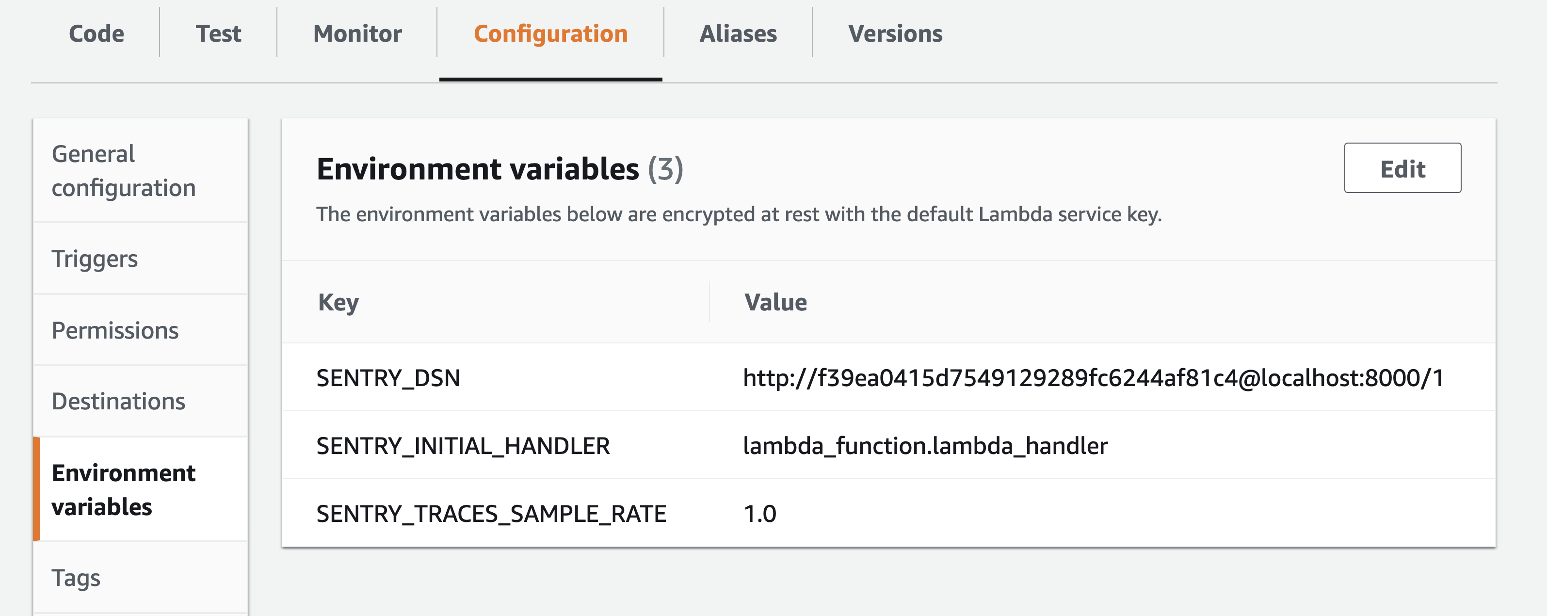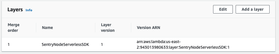 • The layer for Sentry is added to your Lambdas. Any existing layers are honored and the Sentry layer is appended to the end.